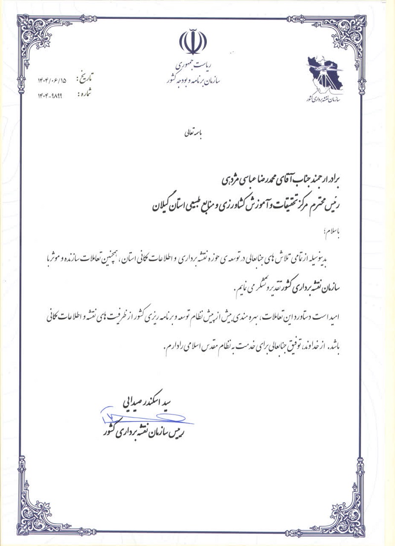 به گزارش روابط عمومی مرکز تحقیقات و آموزش کشاورزی و منابع طبیعی گیلان؛ در پی اقدامات مؤثر در توسعه موزه نقشه‌برداری و اطلاعات مکانی استان گیلان، رئیس سازمان نقشه‌برداری کشور با صدور پیامی رسمی، از تلاش‌های ارزشمند محمدرضا عباسی مژدهی، رئیس مرکز؛ و همچنین از همراهی و همکاری صمیمانه همکاران این مجموعه تقدیر به‌عمل آورد.