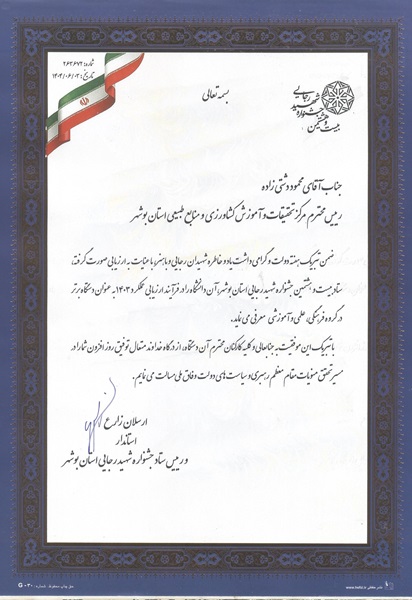 رتبه نخست برگزیده گروه علمی ،فرهنگی و آموزشی جشنواره شهید رجایی به مرکز تحقیقات بوشهر اختصاص یافت